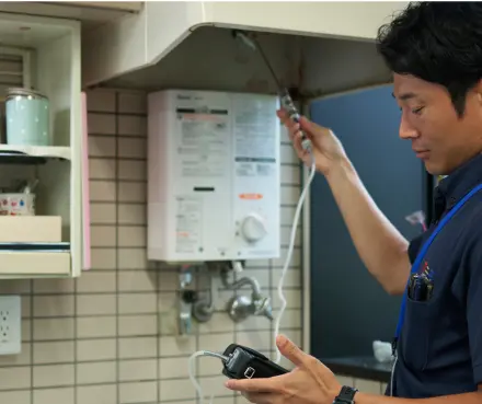 ガス開栓時にボンベ・ガスメーター・ガス管の設置状況の確認、漏えい試験、ガス機器の試運転等の点検を行います。